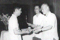 1958年第一届西医离职学习中医研究班毕业典礼,国务院二办副主任张稼夫(右)与鲁之俊(中)为获奖学员颁发证书和奖状。